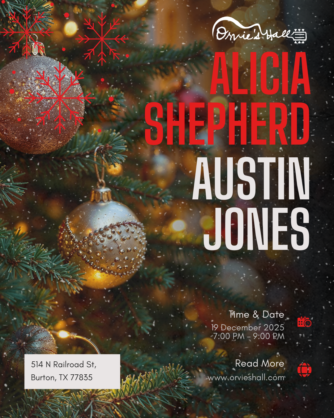 There’s nothing quite like Christmas music in a small Texas town, and on this Friday night Orvie’s Hall is turning into a warm, candlelit listening room. Join us for an evening with Alicia Shepherd and Austin Jones as they bring a full Christmas-themed set to the stage—blending classic holiday favorites, stripped-down acoustic renditions, and a few stories that feel like sitting around the tree with people you actually like.
